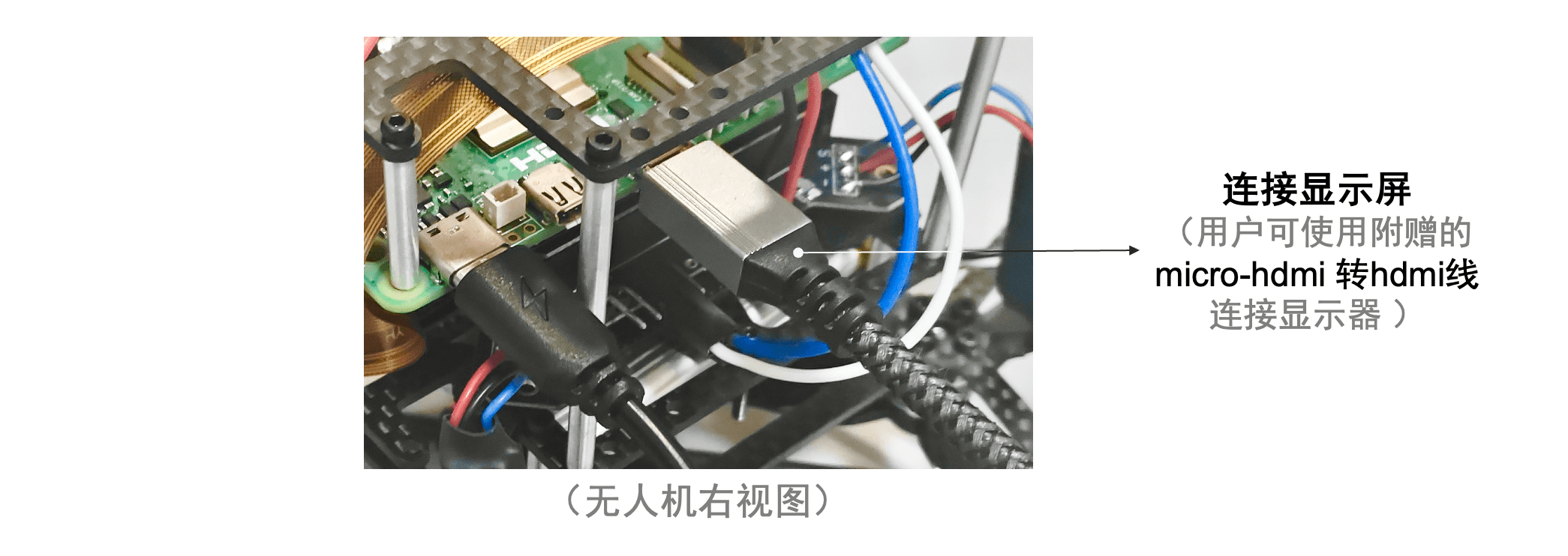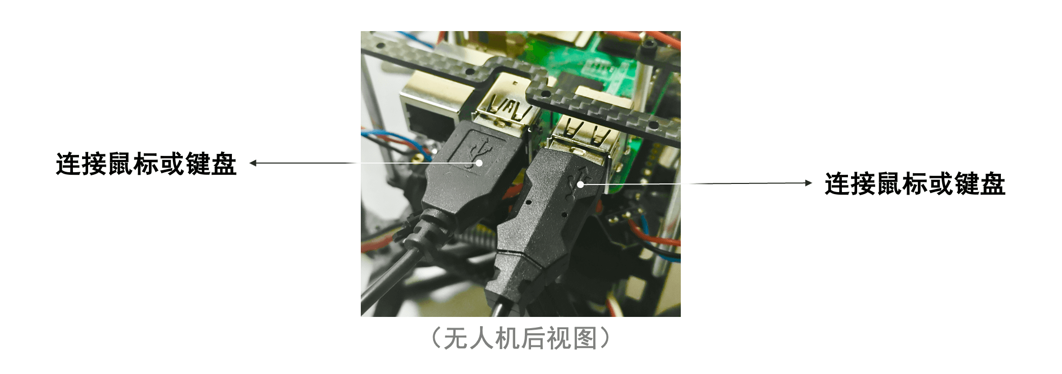 注:无人机静态调试时,请用USB线为飞控供电,切勿用无人机电池供电,防止电池过放,如下图所示: