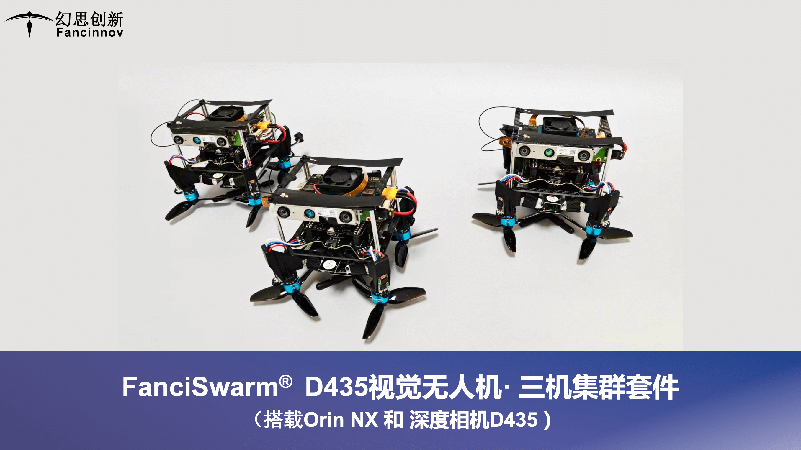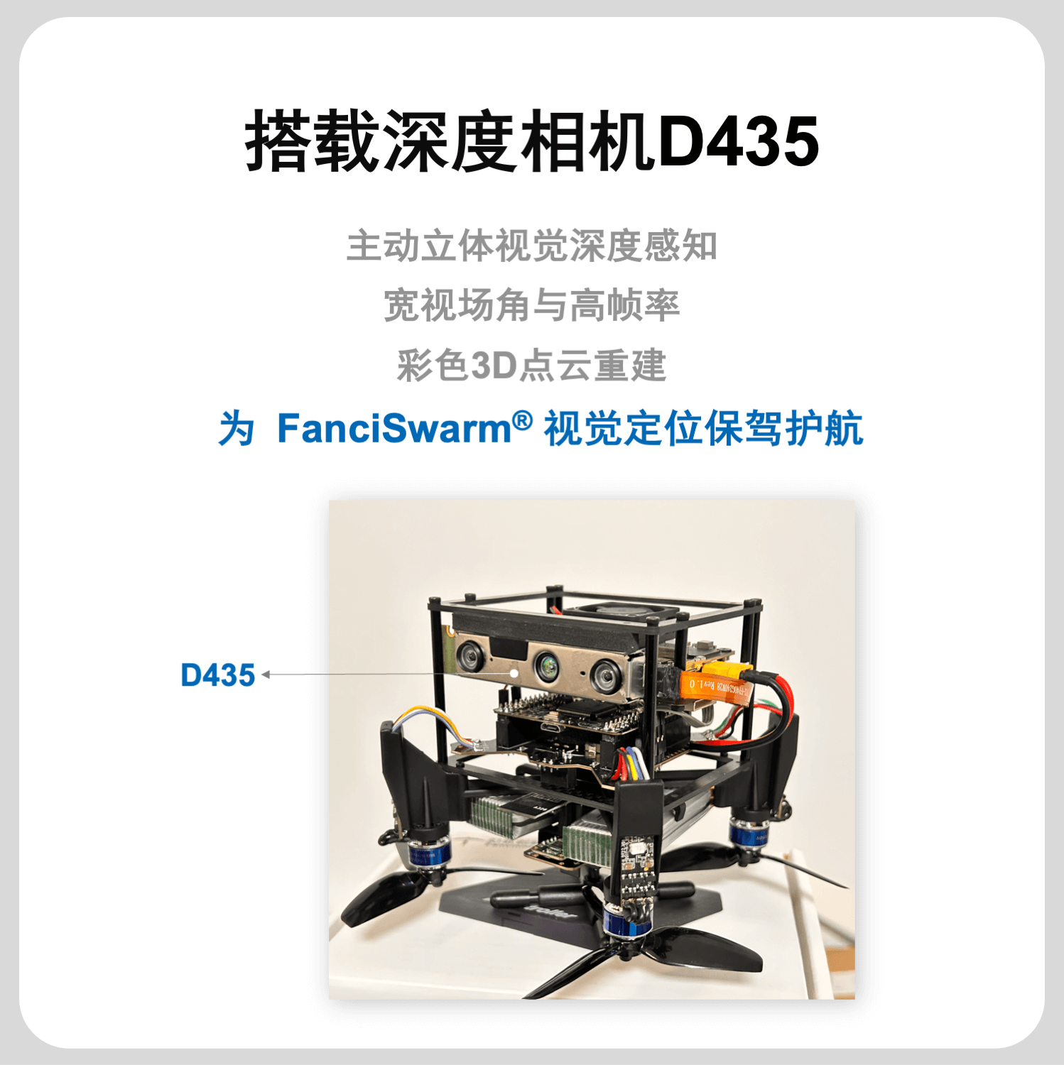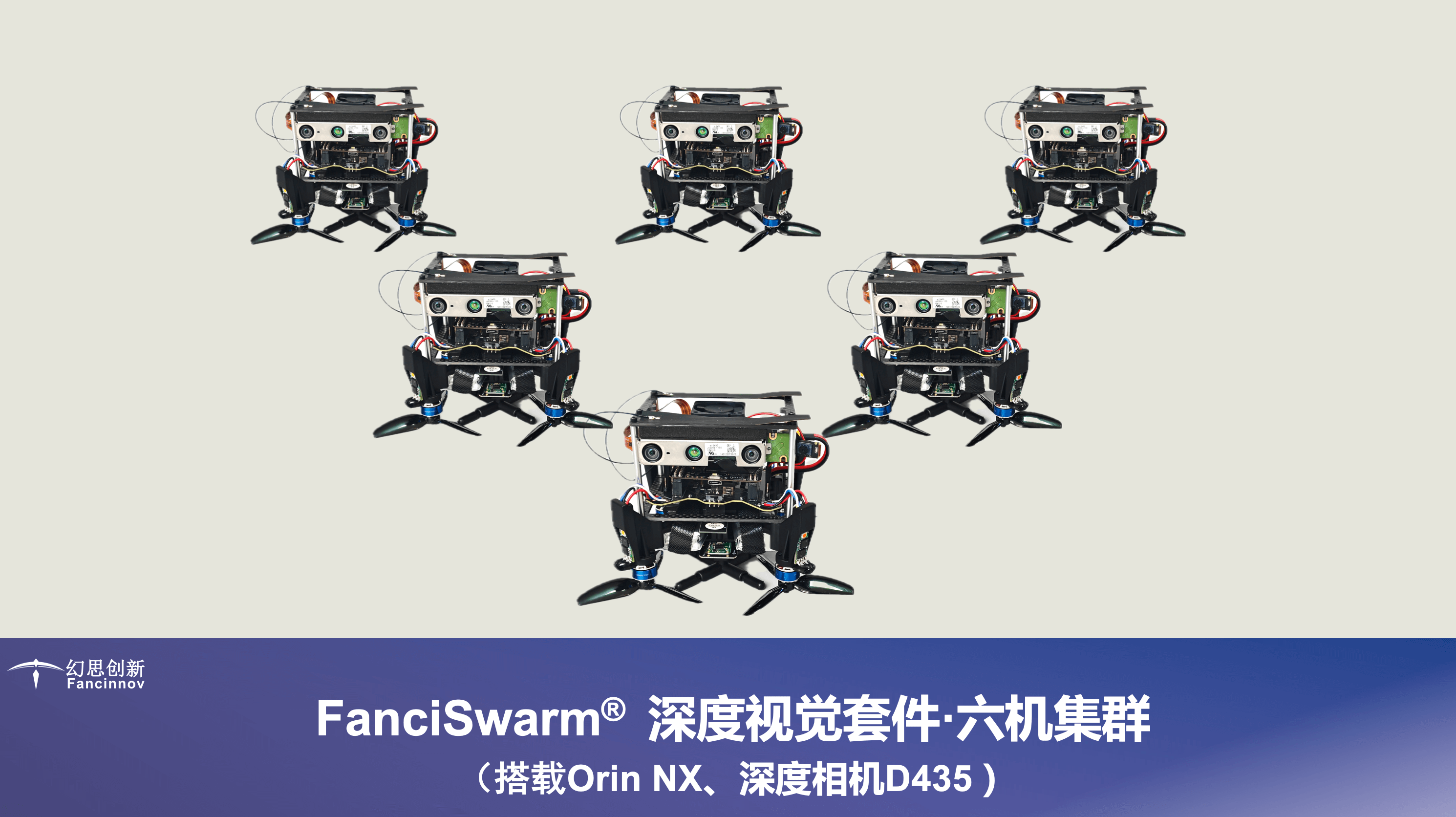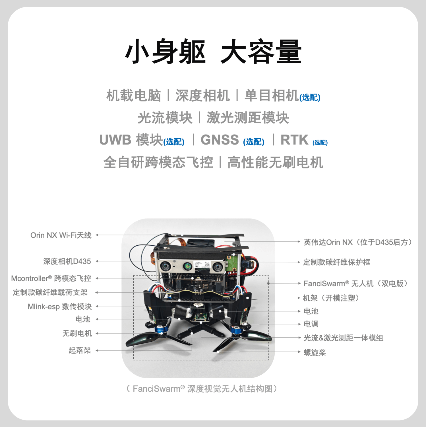 构成:由FanciSwarm® 微型集群无人机、定制款碳纤维载荷支架、定制款碳纤维保护框、Orin NX 或者Orin Nano 核心板以及底板、深度相机 D435、单目 RGB相机(选配)、高精度 GNSS模组(选配)、512g 固态硬盘、散热风扇等构成,调试安装好,整机发货,到手即飞