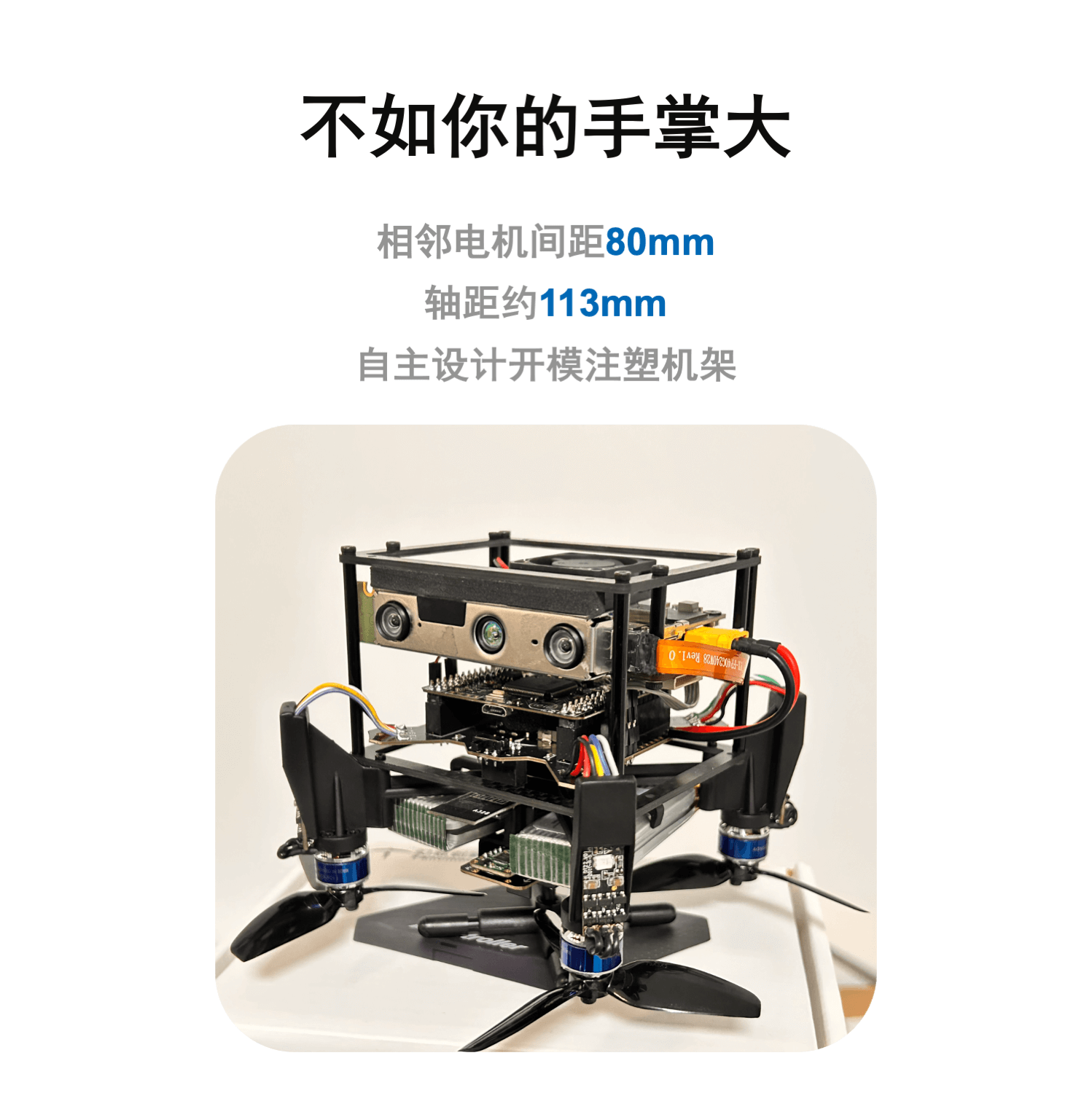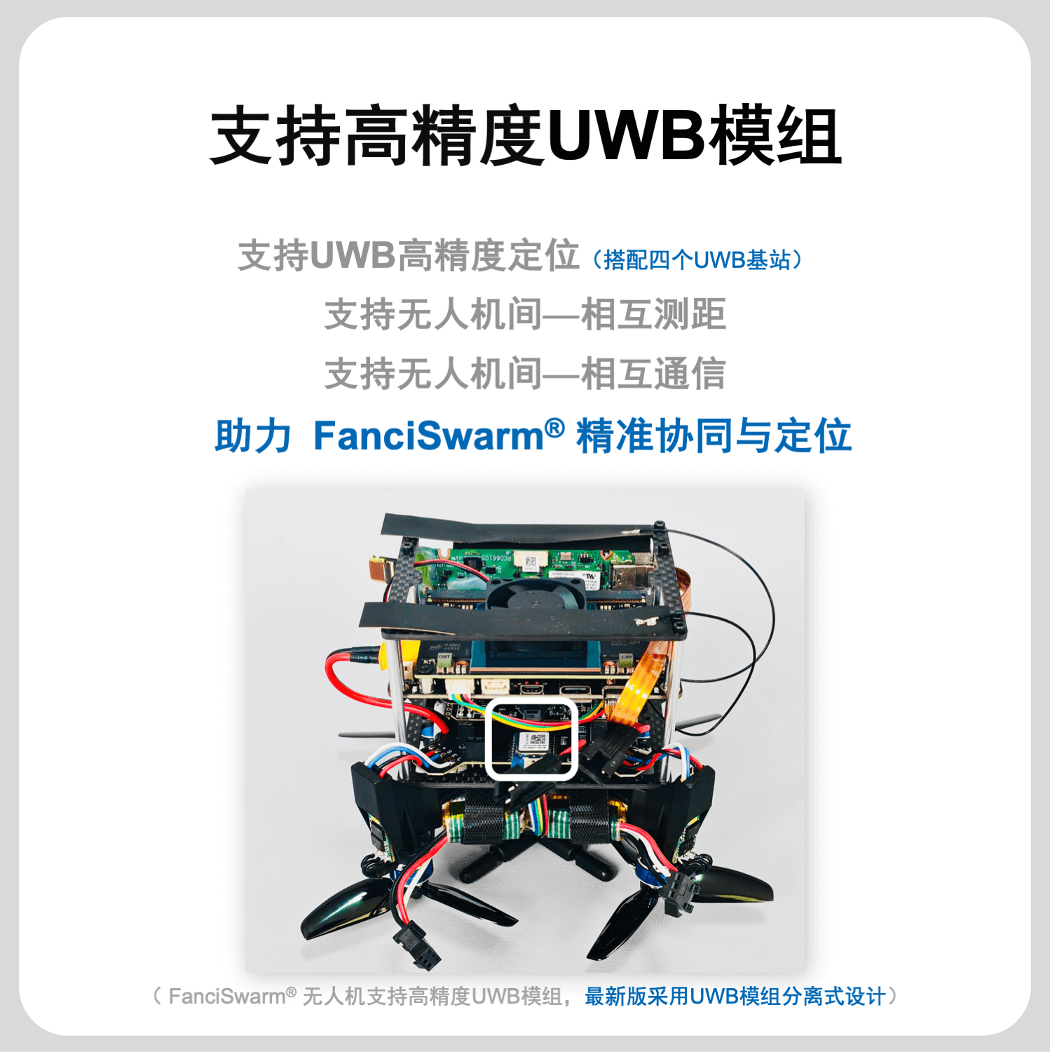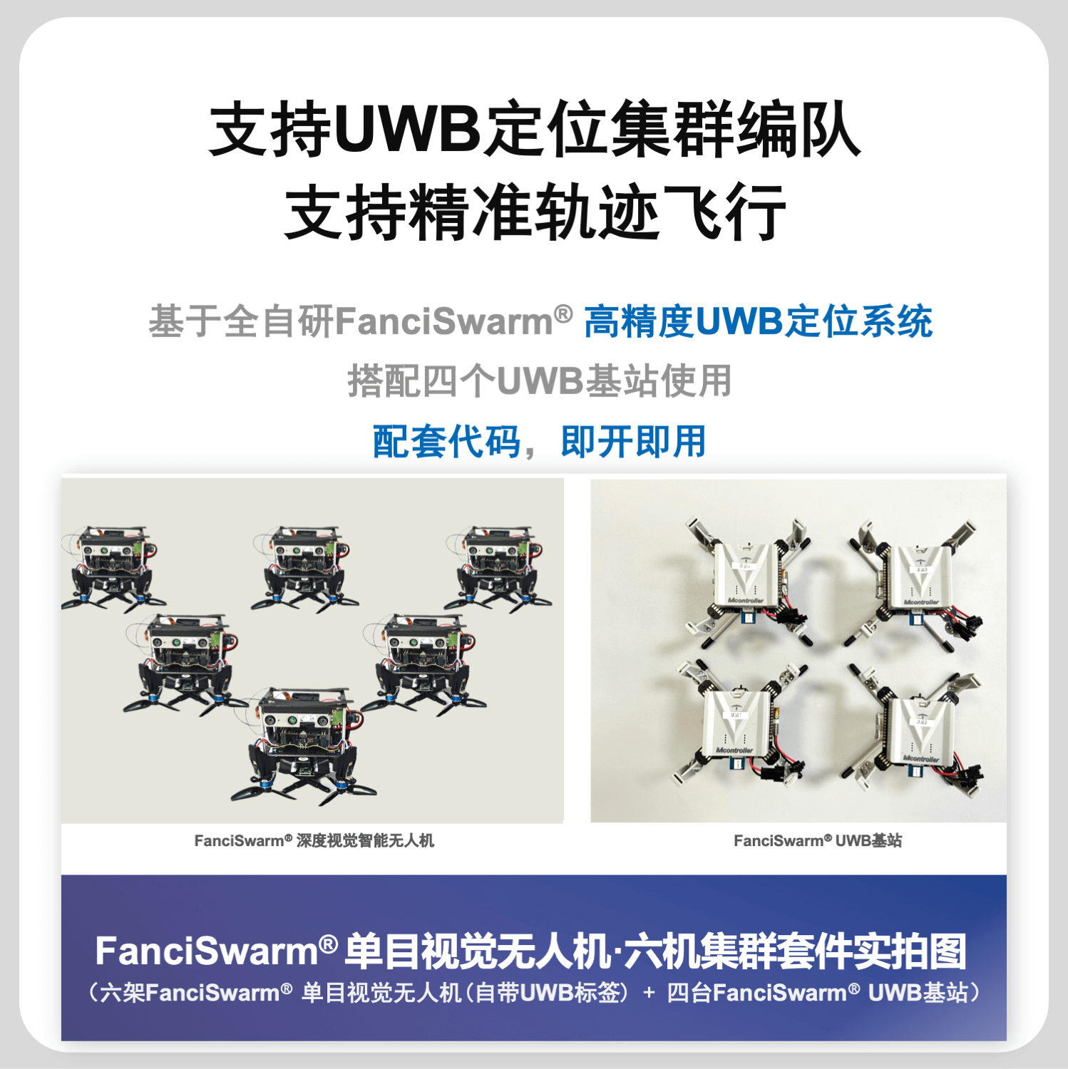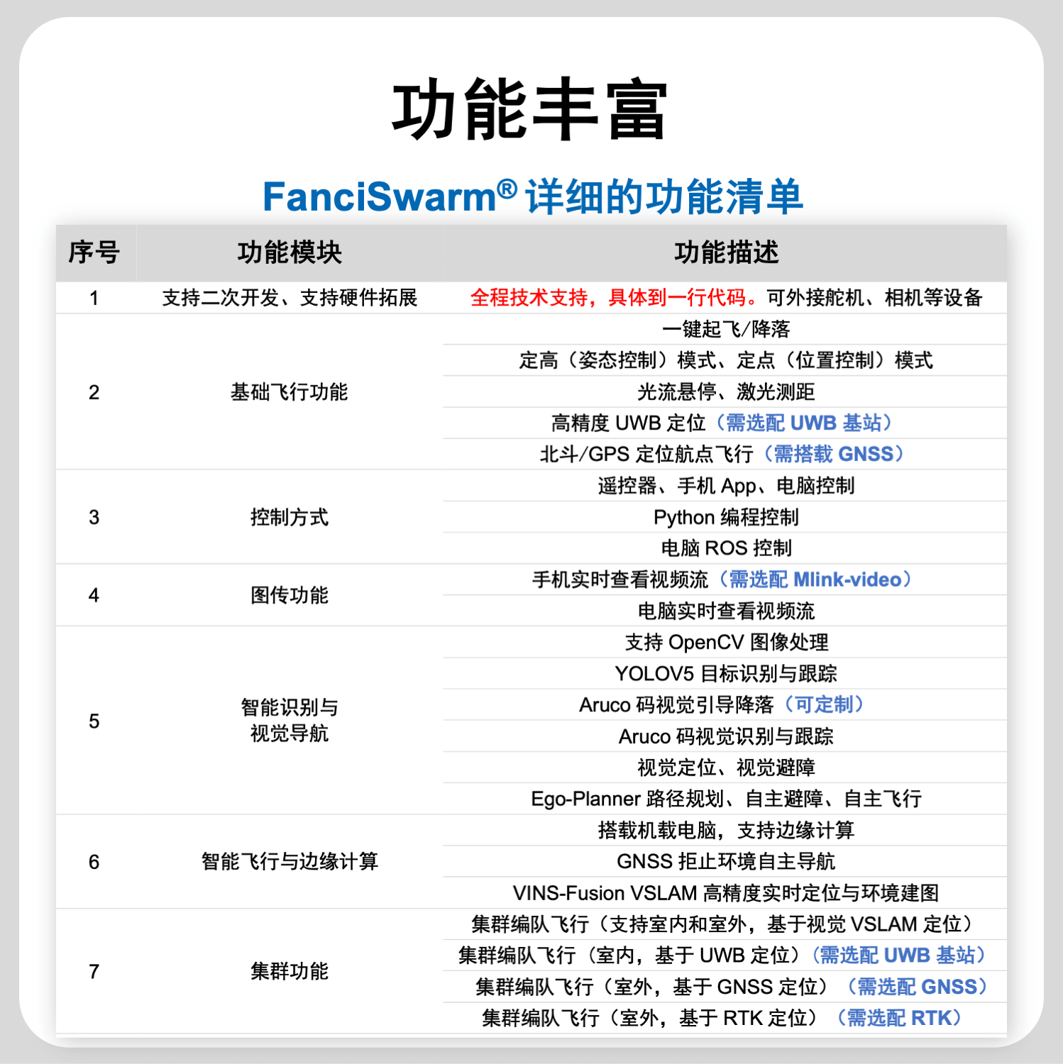 构成:由FanciSwarm® 微型集群无人机、定制款碳纤维载荷支架、定制款碳纤维保护框、Orin NX 或者Orin Nano 核心板以及底板、深度相机 D435、单目 RGB相机(选配)、高精度 GNSS模组(选配)、512g 固态硬盘、散热风扇等构成,调试安装好,整机发货,到手即飞
