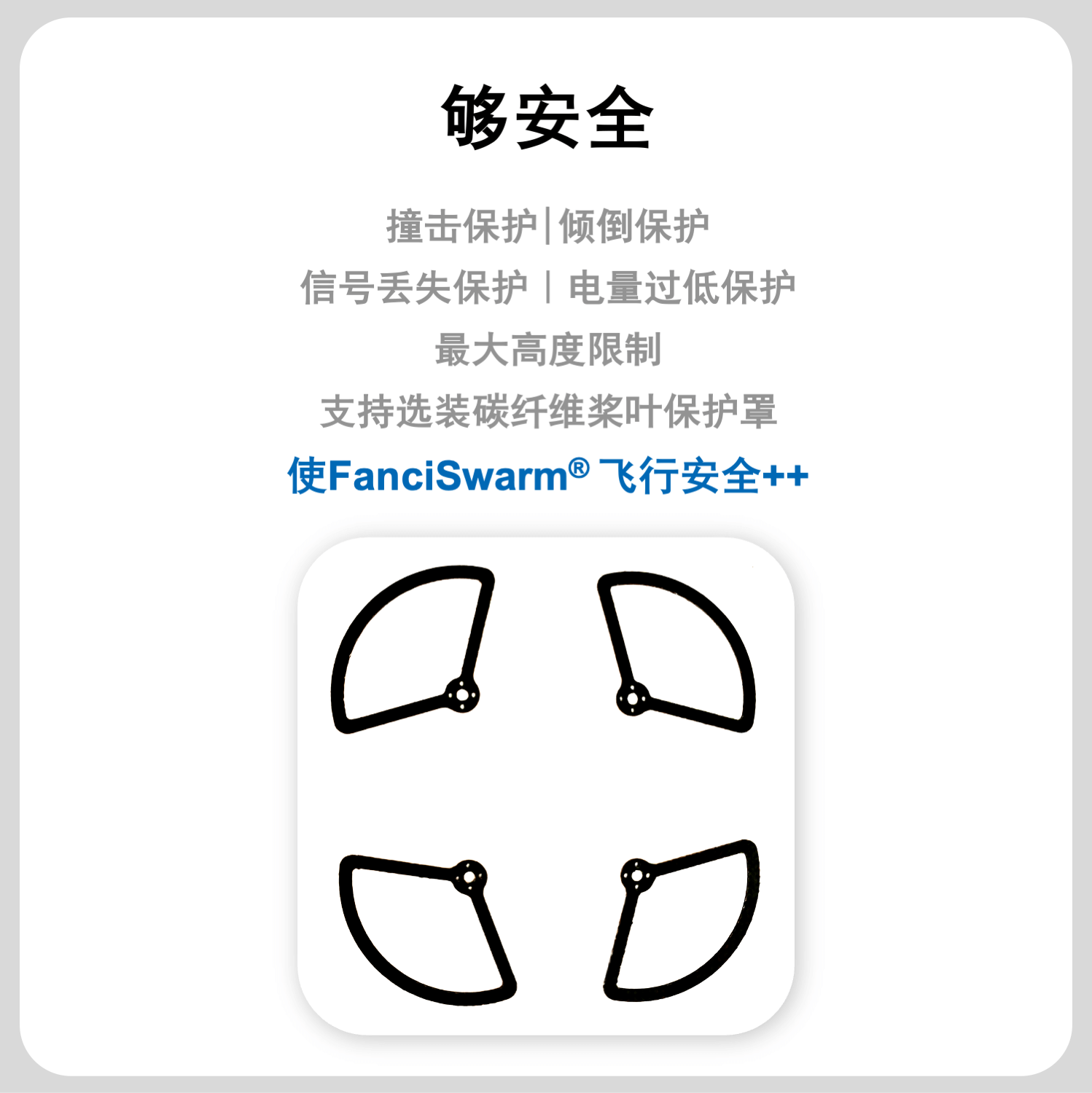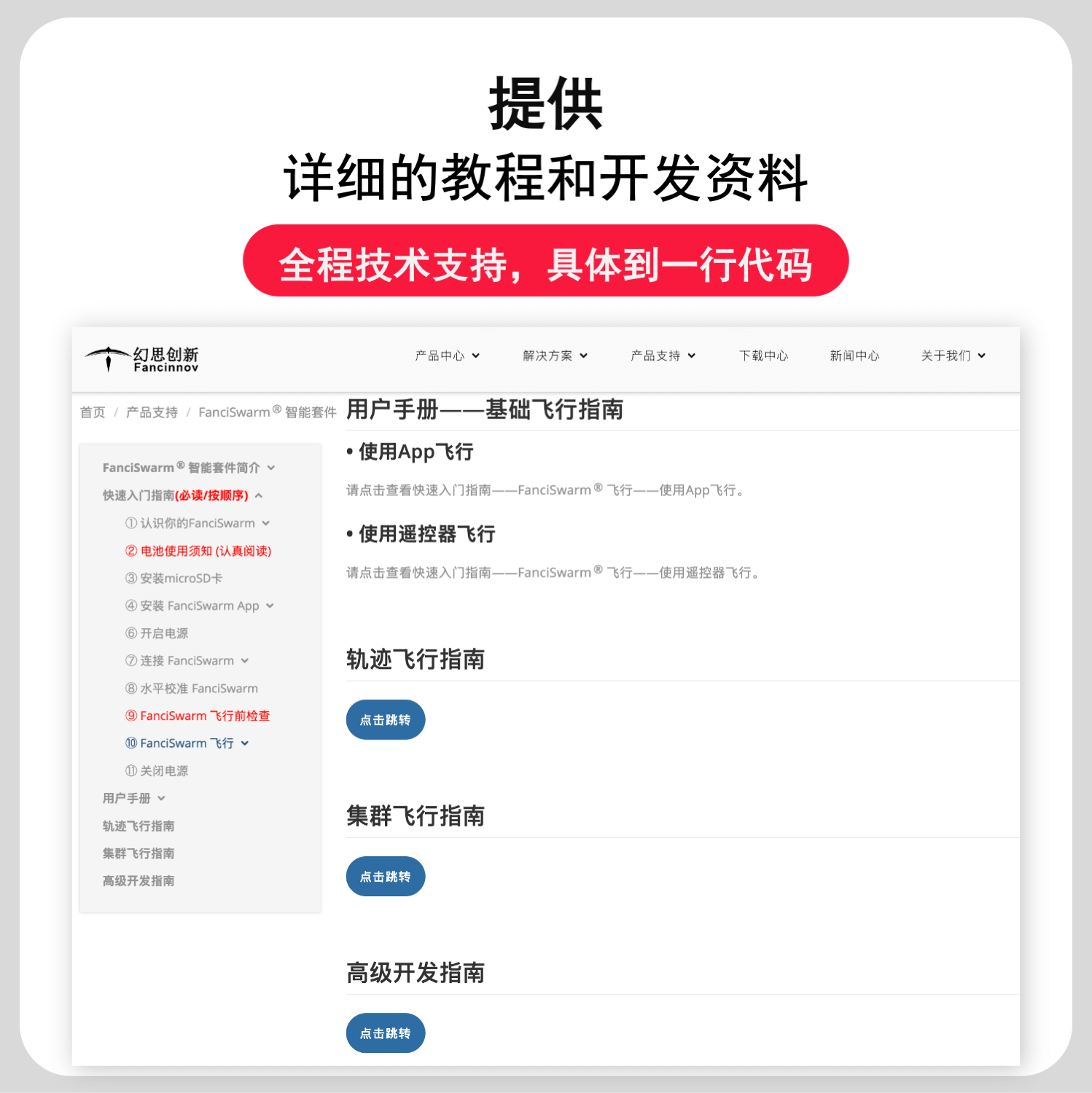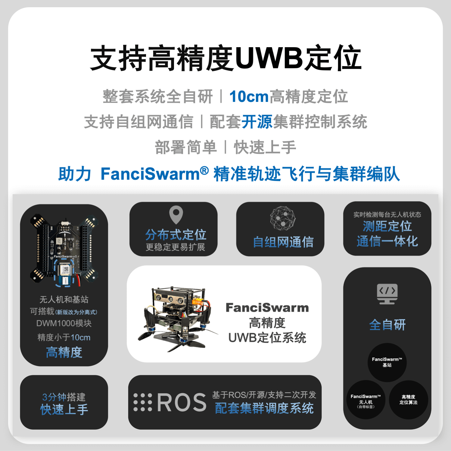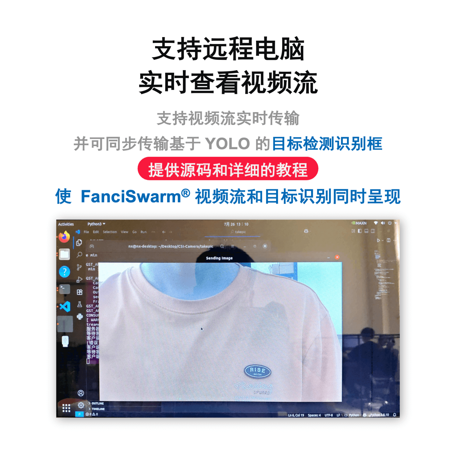构成:由FanciSwarm® 微型集群无人机、定制款碳纤维载荷支架、定制款碳纤维保护框、Orin NX 或者Orin Nano 核心板以及底板、深度相机 D435、单目 RGB相机(选配)、高精度 GNSS模组(选配)、512g 固态硬盘、散热风扇等构成,调试安装好,整机发货,到手即飞