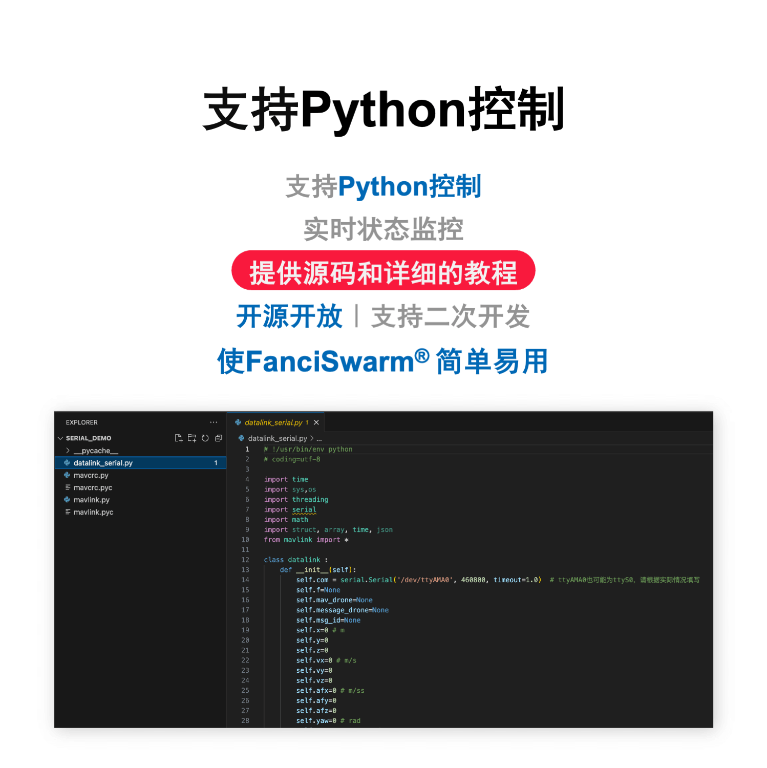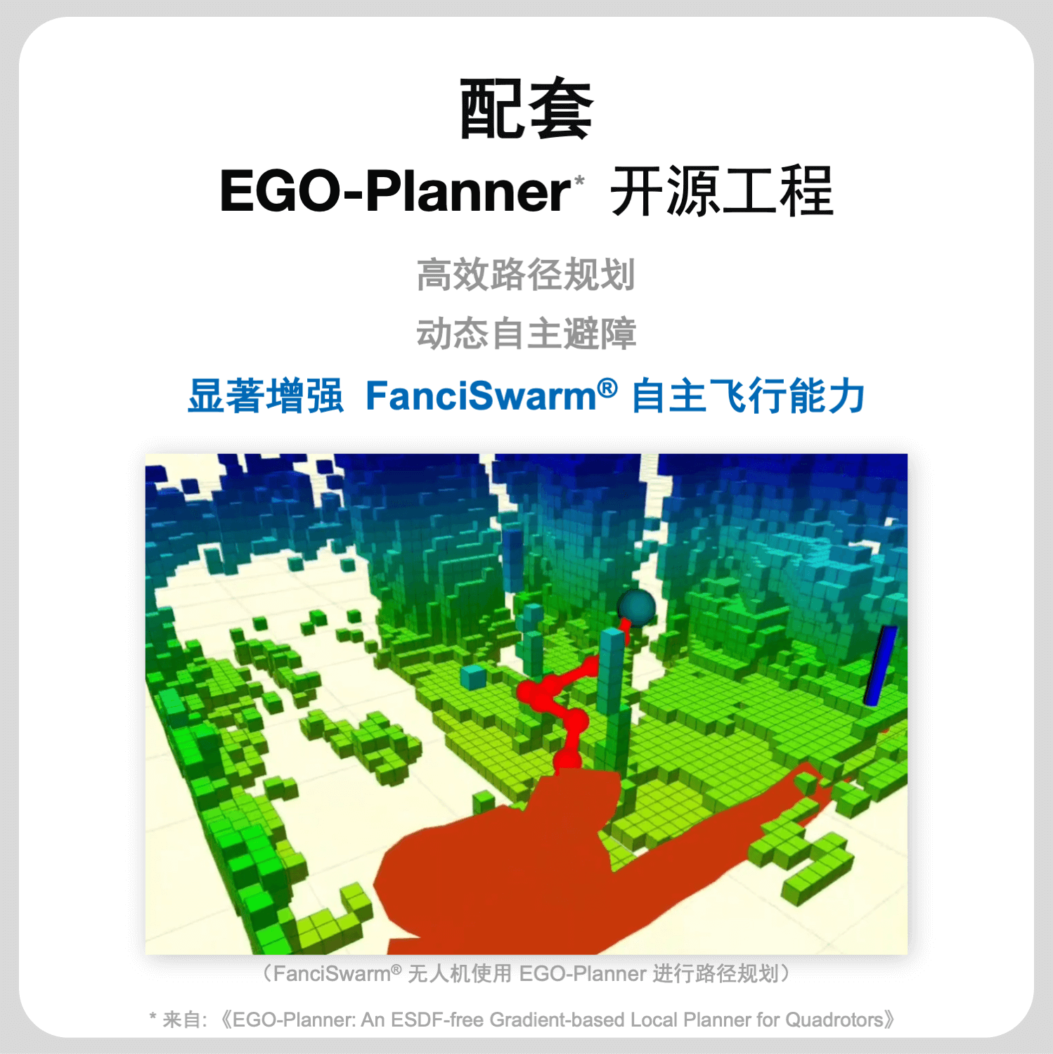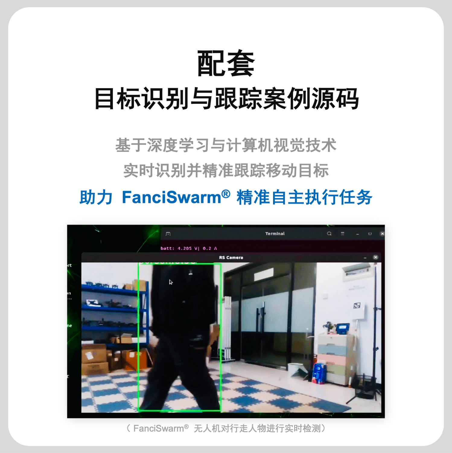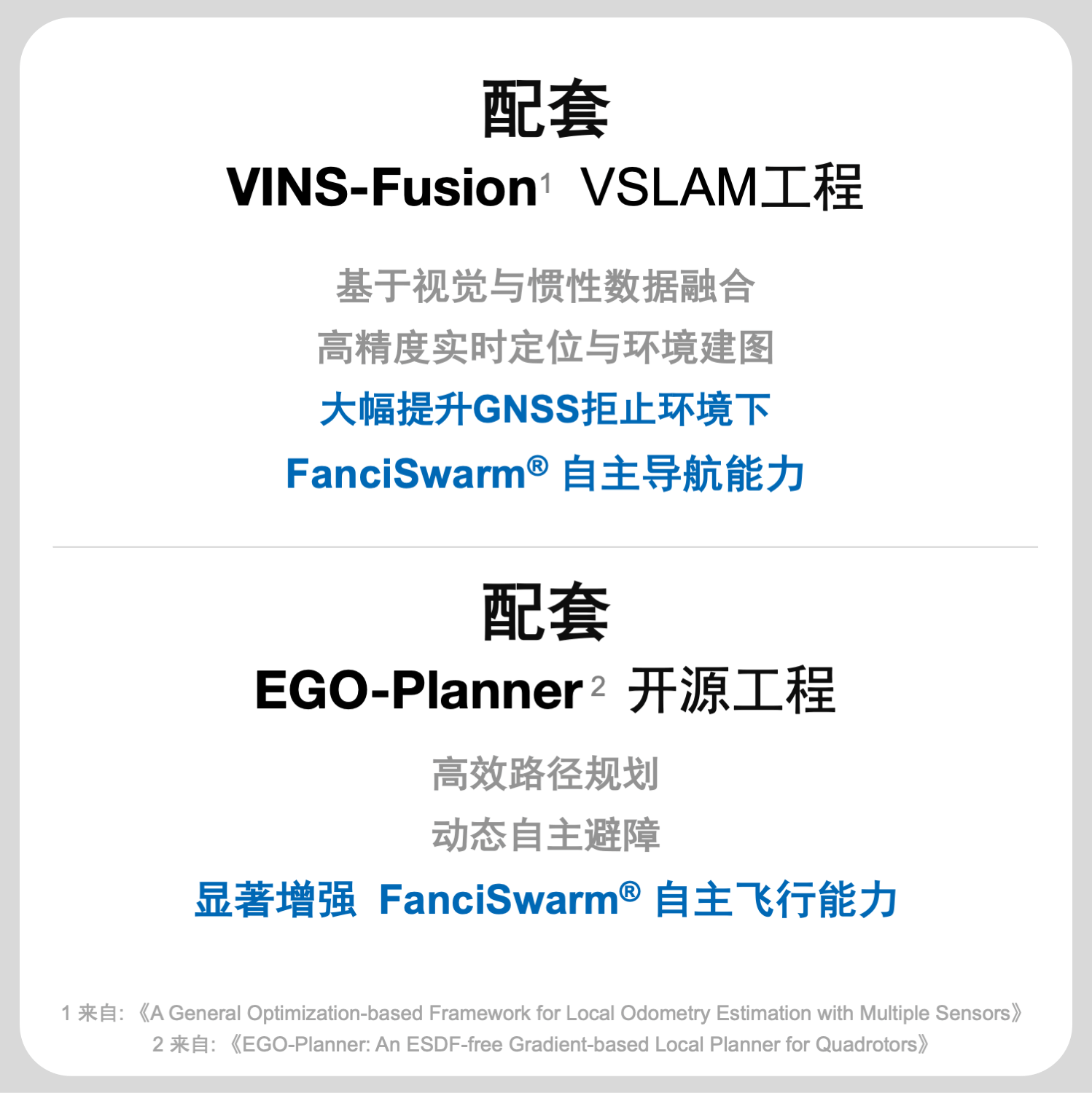 FanciSwarm® 深度相机套件预装 Ubuntu20.04 和 ROS Noetic,开箱即用,省时高效;配套 VINS-Fusion VSLAM 工程,高精度实时定位与环境建图,大幅提升GNSS拒止环境下FanciSwarm® 自主导航能力;配套 EGO-Planner 开源工程,高效路径规划,动态避障;配套目标识别与跟踪案例源码,实时识别并精准跟踪移动目标,助力 FanciSwarm® 精准自主执行任务;配套自研的 FanciSwarm® 集群调度系统,赋予无人机卓越的集群协同能力......这些技术的结合,为用户提供了一个灵活、高度集成且易于扩展的平台,以实现更高级的无人机应用和研究。