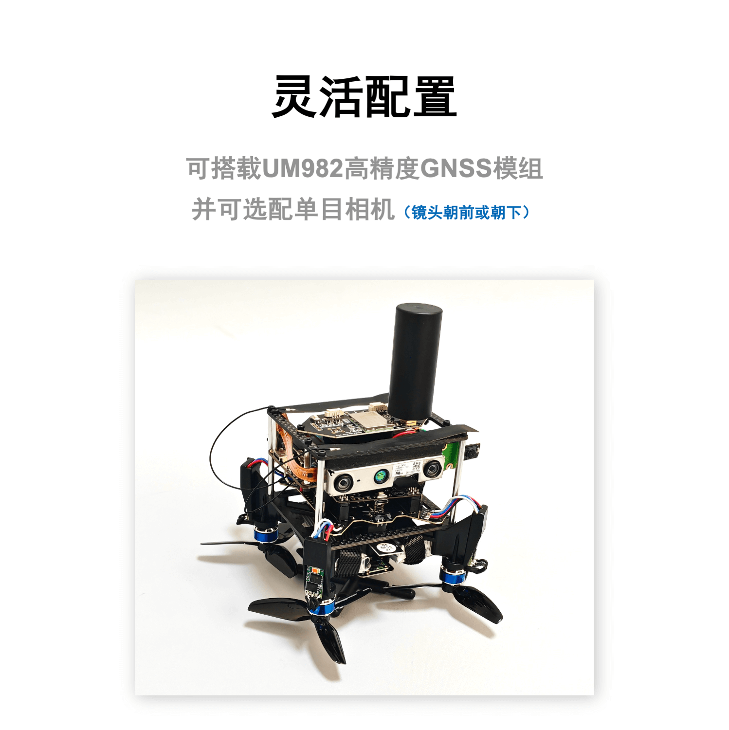 该套件搭载 Intel RealSense D435 双目深度相机,具备宽视场角与高帧率,支持主动立体视觉深度感知和彩色3D点云重建 ,提供全面的环境感知,增强无人机在复杂空间中的定位与避障能力。其小巧的体积便于安装,同时保证了强大的感知功能。此外,套件还支持选配单目相机和高精度 GNSS 模组,进一步提升环境感知与定位能力,拓展了无人机的应用范围和功能。