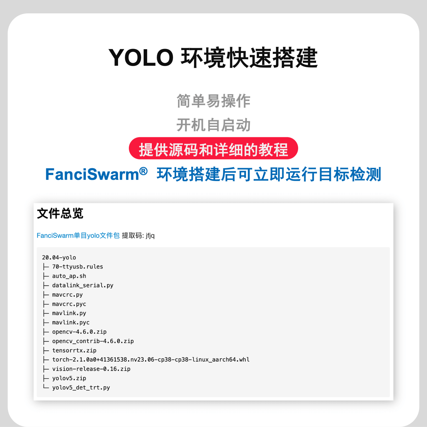 FanciSwarm® 单目视觉套件预装 Ubuntu20.04 和 ROS Noetic,开箱即用,省时高效;配套 YOLO环境快速搭建与运行指南、视频流无线传输开发指南、YOLO 算法训练与部署全流程开发指南、Aruco码视觉识别与追踪开发指南、Aruco码视觉引导降落开发指南,实时识别并精准跟踪移动目标,助力 FanciSwarm® 精准执行任务;配套自研的 FanciSwarm® 集群调度系统,赋予无人机卓越的集群协同能力......这些技术的结合,为用户提供了一个灵活、高度集成且易于扩展的平台,以实现更高级的无人机应用和研究。