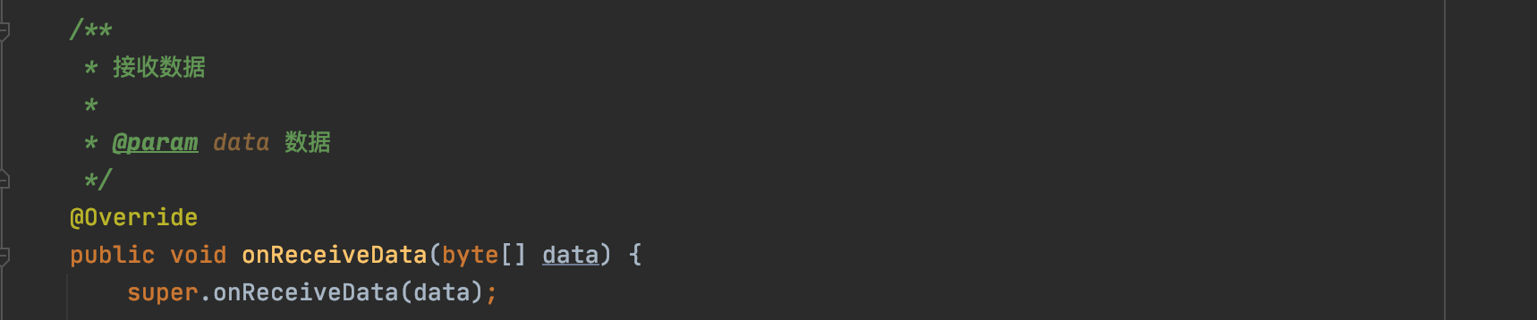byte[] data: 接收到的原始byte数组。需要在BaseApplication 的子类重载onReceiveData,可参考文件下载中的Android SDK 调用demo。如下图所示: