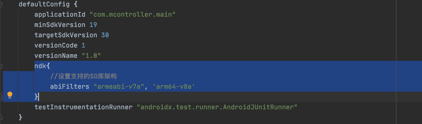 若不使用NDK,可以不设置。结合NDK使用,在build.gradle的android.defaultConfig.ndk中进行设置。如下图所示: